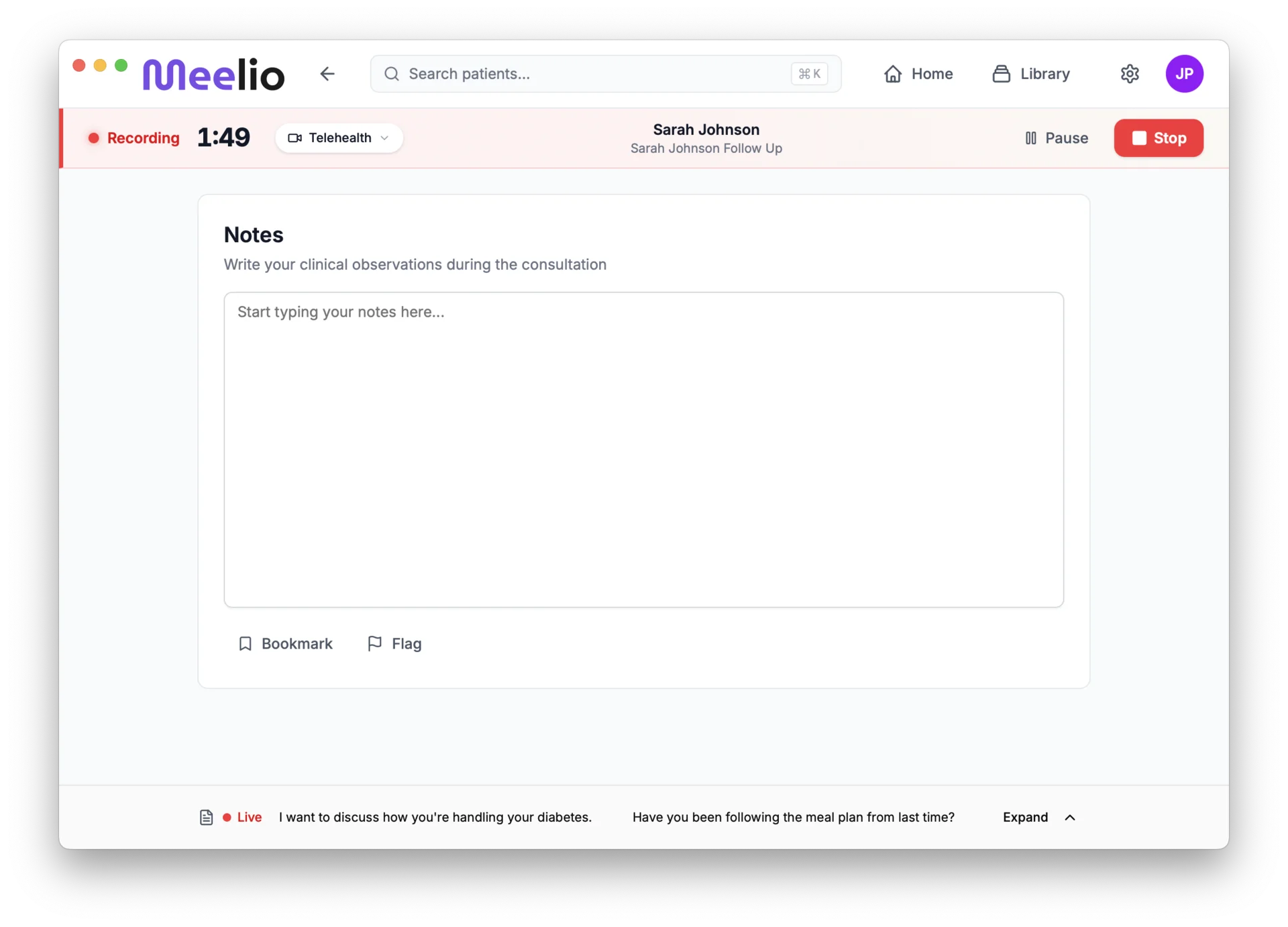 Accurate transcription of patient consultations with speaker identification, timestamps, and clinical context preserved throughout the visit.